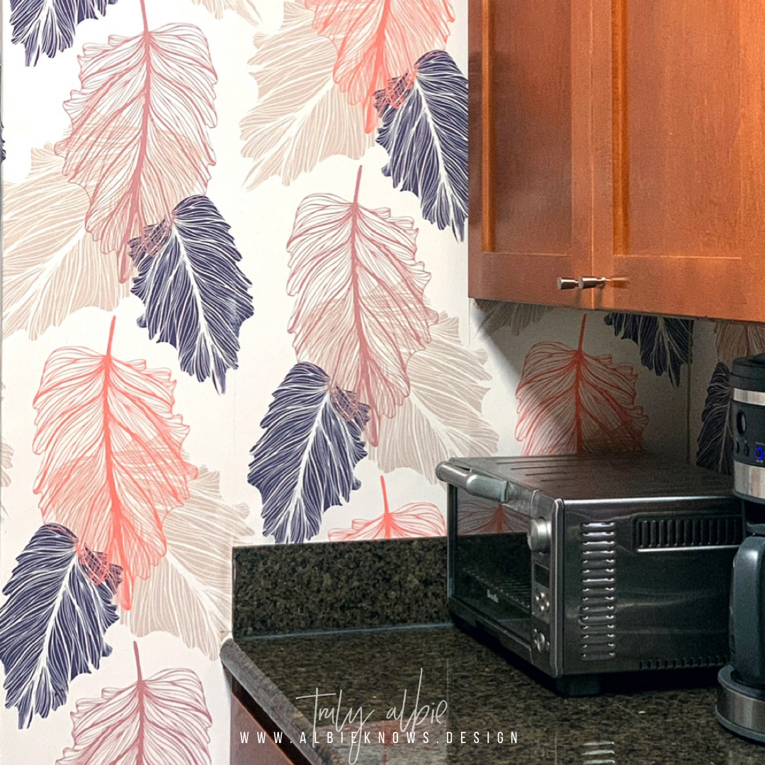 After some additional thought, I ruled out Travelers Palm and Tribal Mud, and hung my samples of Queen Palm and Shedding on the kitchen wall for about a week. I did this to see if after some time, I would still love the designs, and to see how they actually blended in with the rest of the kitchen. After going in and out of the kitchen, looking at both designs day in & day out, Shedding was my favorite!